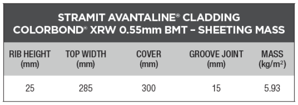 The walling shall be 0.55mm BMT Stramit AvantaLine® cladding in continuous lengths with 25mm high ribs and flat tops spaced at specified centres to suit fixing methods.