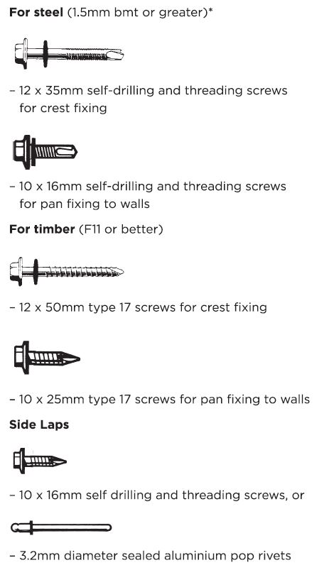 All external fastening screws must conform to AS3566 – suitable for minimum corrosivity category 3. They are to be hexagon headed and must be used with sealing washers for both roofing and walling.