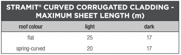 Stramit® Curved Corrugated and Bullnose Roof Cladding can be supplied in any length from 500mm to 4000mm. Longer lengths may be supplied by arrangement. When measuring it should be noted that at the end of each curve adjacent to the curve there is at least 100mm that cannot be curved which must be allowed for.
