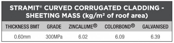 The roofing/walling shall be 0.60mm BMT Stramit® Curved Corrugated cladding in continuous lengths with sinusoidal ribs 16mm high, spaced at 76.2mm centres in accordance with AS 1445, curved to a radius of _____mm. Sheeting material shall be protected steel sheet to Australian Standard AS 1397, with a minimum yield stress of 300MPa (Grade G300) and an AM100/AZ150 coating with an oven-baked paint film of selected colour, or a plain AM125/AZ150 coating.