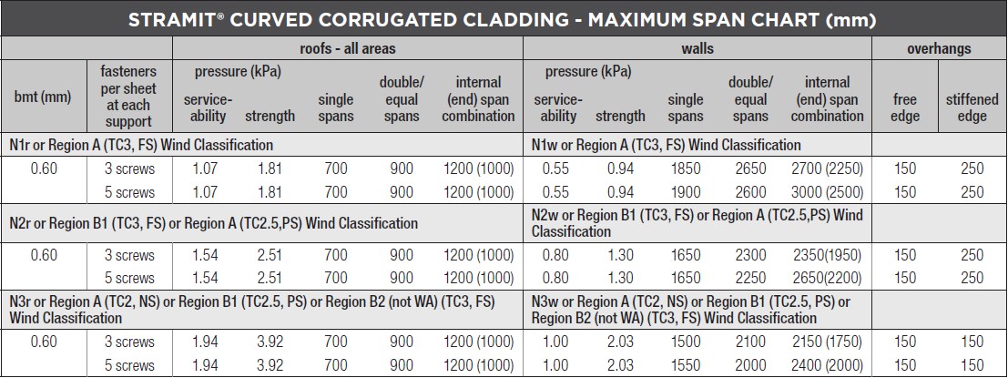 The spans shown below take account of 'normal' foot traffic and wind resistance including local pressure zone effects. Pressures are based on AS 4055:2021 or AS/NZS 1170.2:2021.
