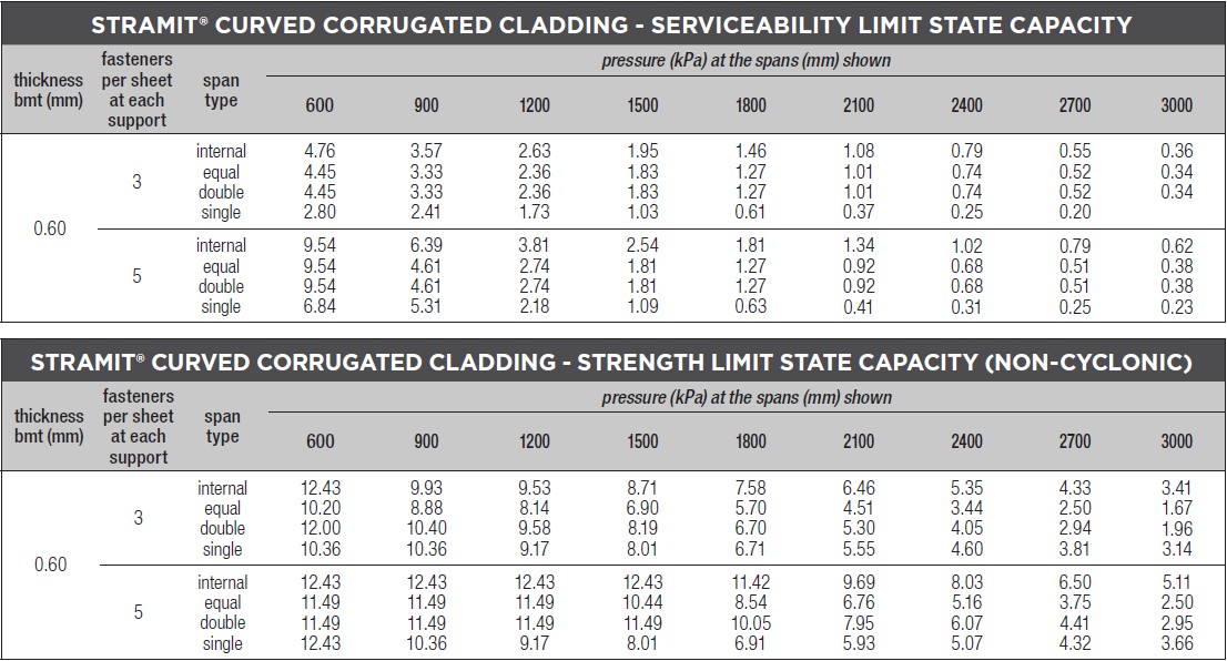 *At these radii a maximum support spacing of 900mm applies, and limit state pressure capacities are reduced by 14% for serviceability and 7% for strength. These reductions apply proportionately up to the lowest neutral radius. Minimum 5 fasteners required per sheet at ends.