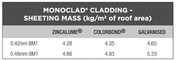 The roofing/walling shall be 0.42 (or 0.48) mm BMT Stramit Monoclad® Roof and Wall Cladding in continuous lengths with trapezoidal ribs approximately 29mm high, spaced at 190mm centres. Sheeting material shall be protected steel sheet to Australian Standard AS1397, with a minimum yield stress of 550MPa (Grade G550) and an AM100/AZ150 coating with an oven-baked paint film of selected colour, or a plain AM125/AZ150 coating.